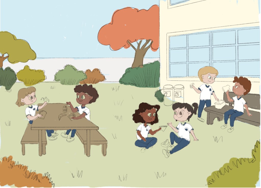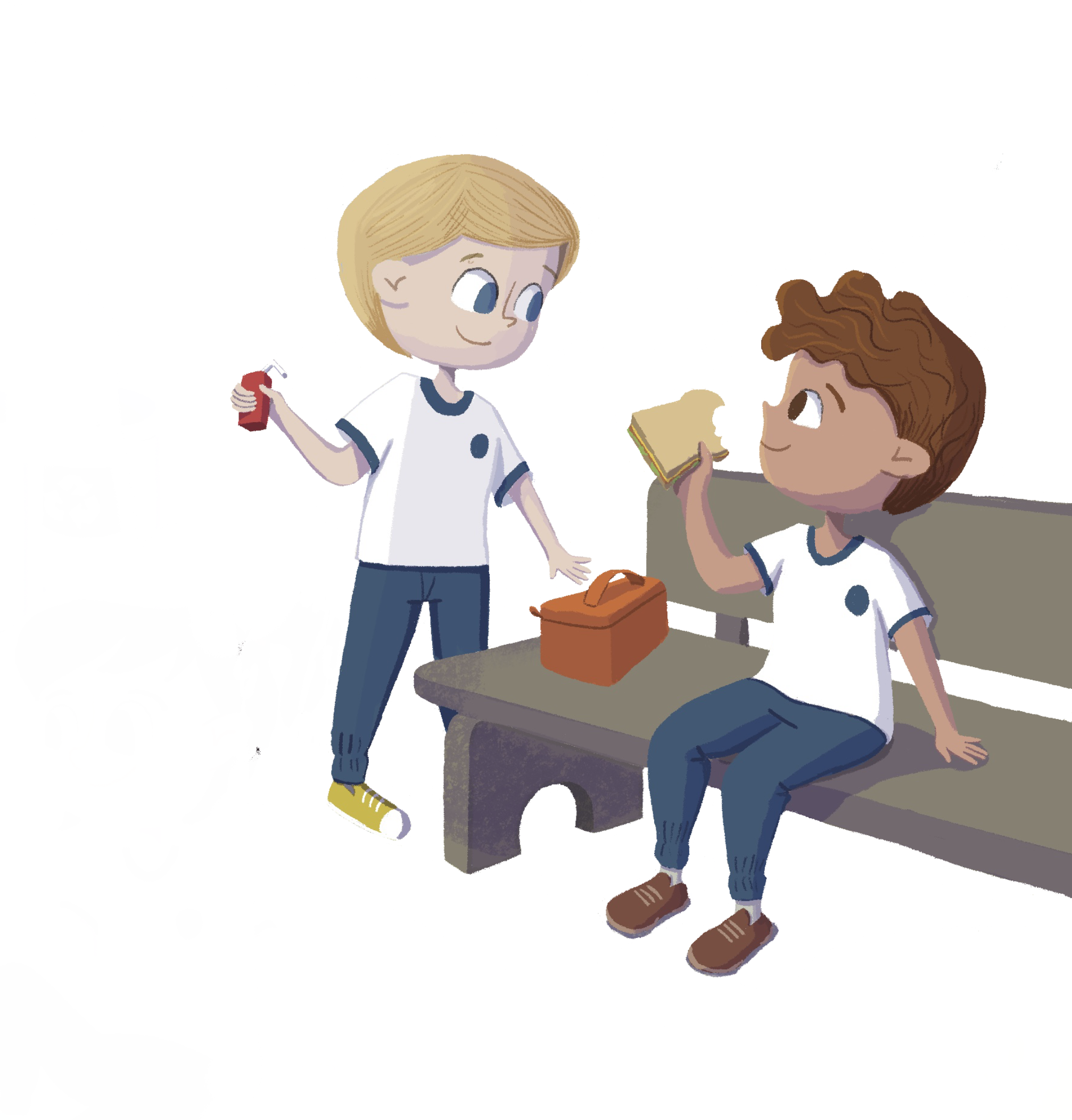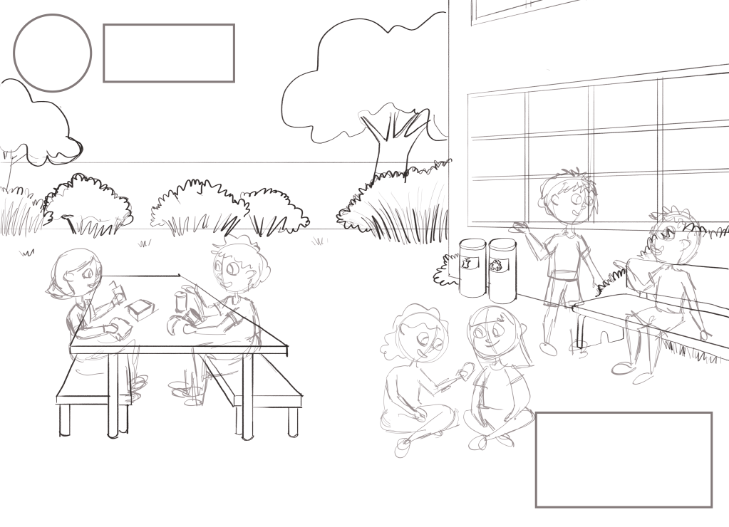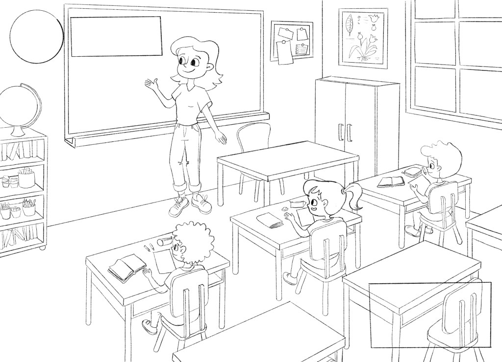 (Pt.) Este é um projeto conceitual desenvolvido para aberturas de capítulo de livros didáticos. Escolhi representar diferentes crianças em situações dentro da escola, uma na hora do recreio e outra na sala de aula. E adorei fazê-lo então vou compartilhar as artes finais e também o processo.