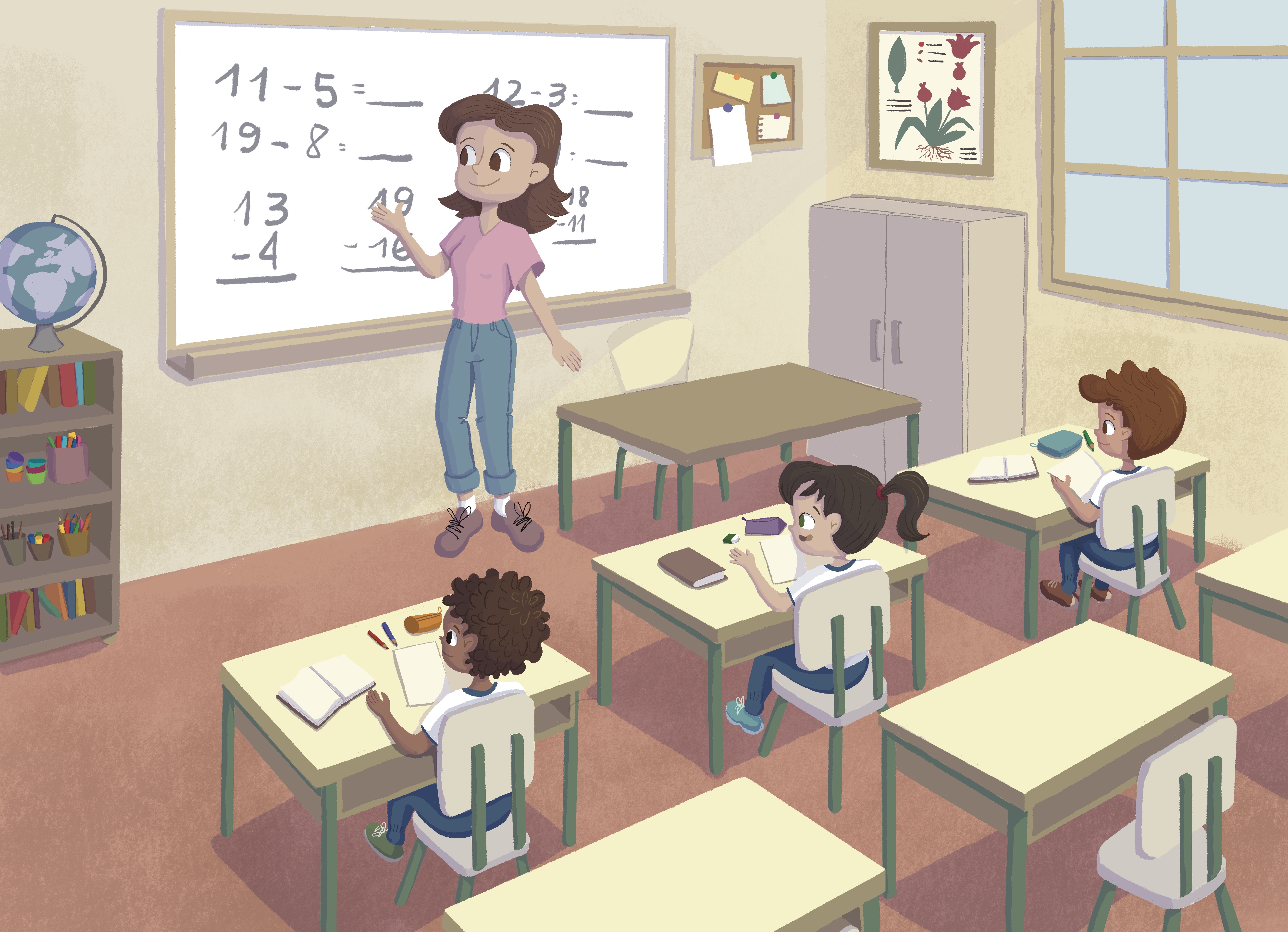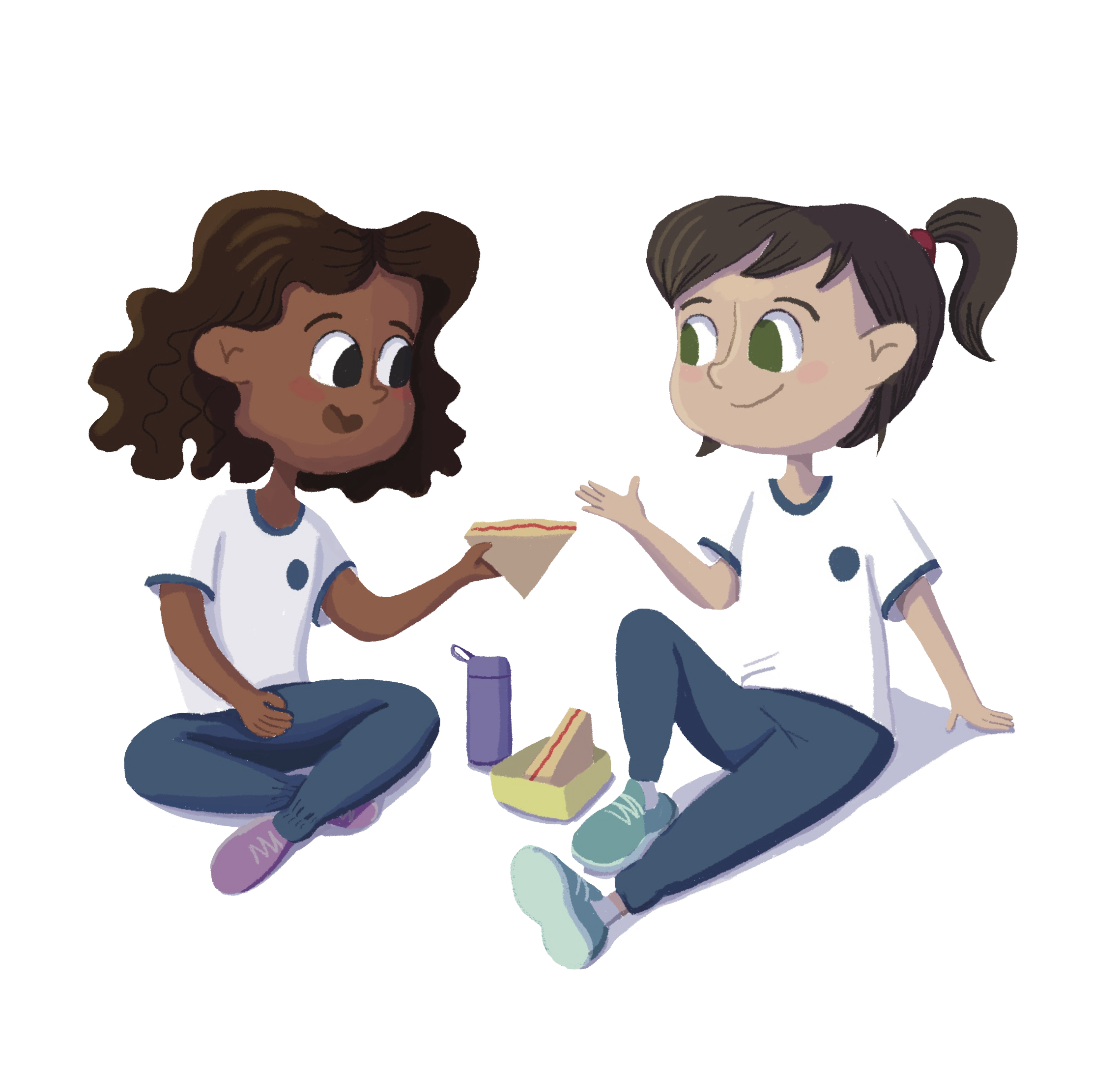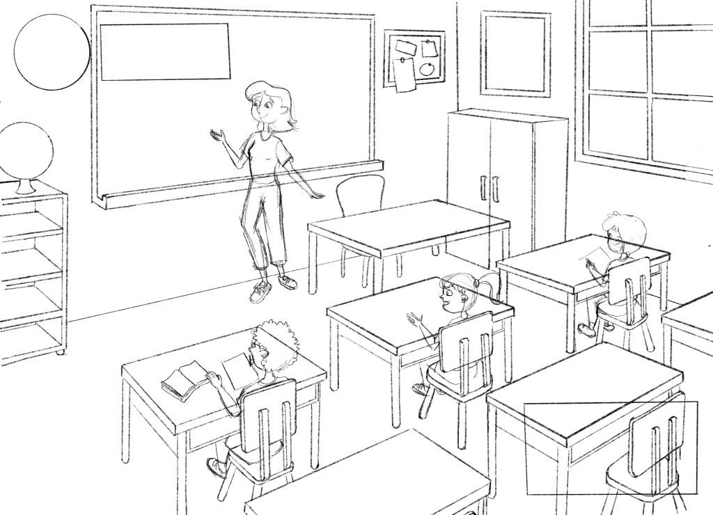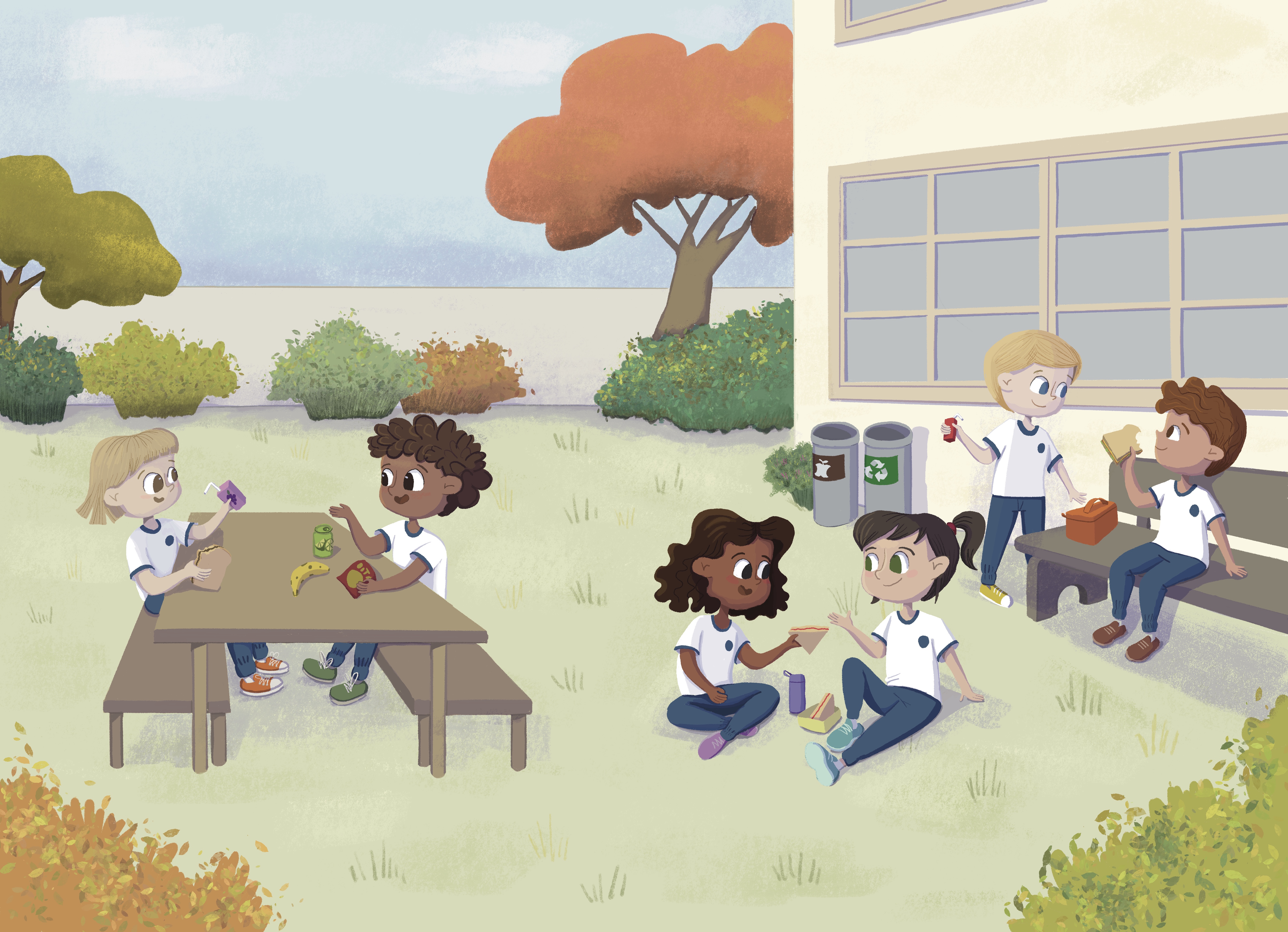 (Pt.) Este é um projeto conceitual desenvolvido para aberturas de capítulo de livros didáticos. Escolhi representar diferentes crianças em situações dentro da escola, uma na hora do recreio e outra na sala de aula. E adorei fazê-lo então vou compartilhar as artes finais e também o processo.
