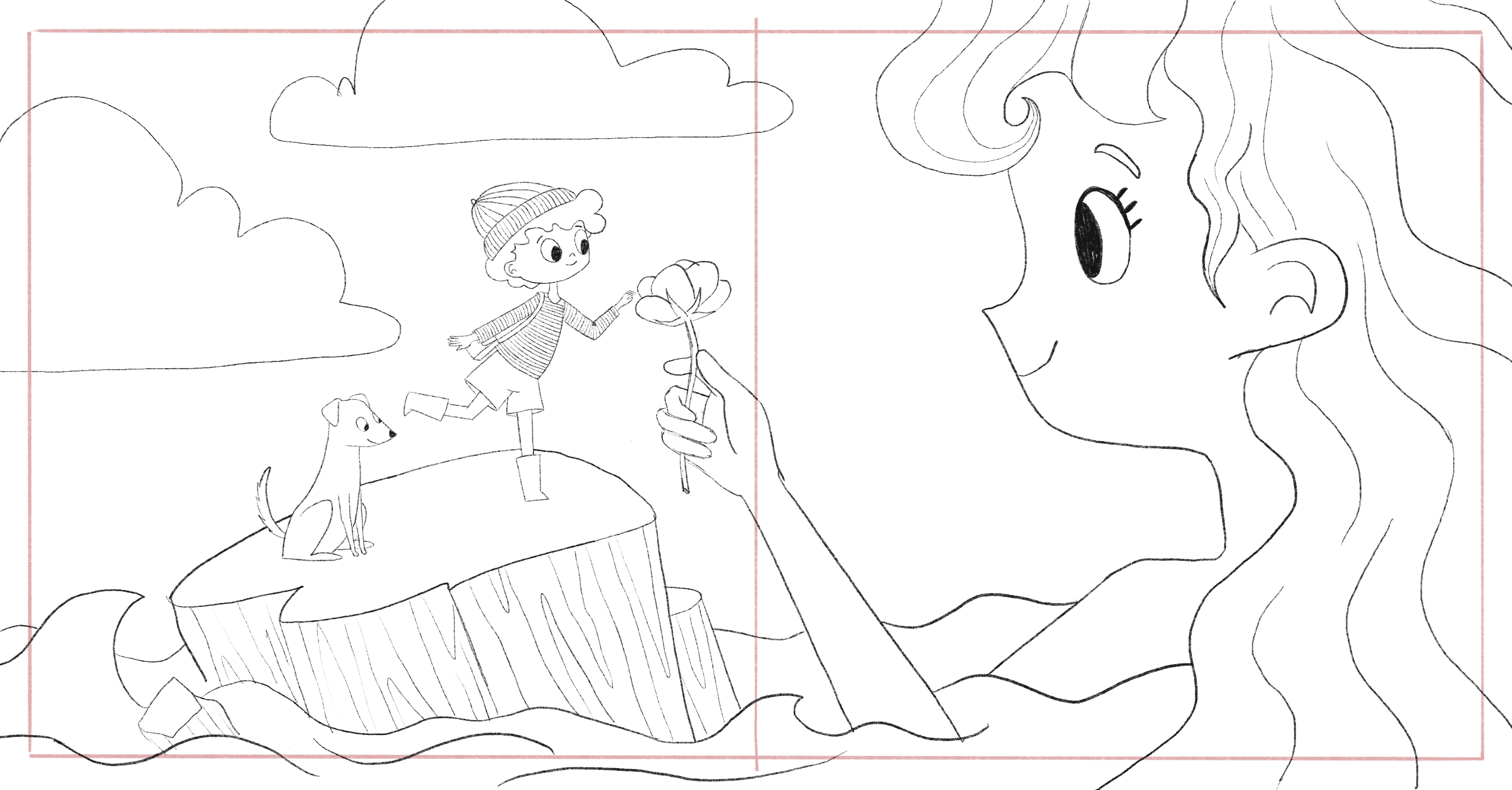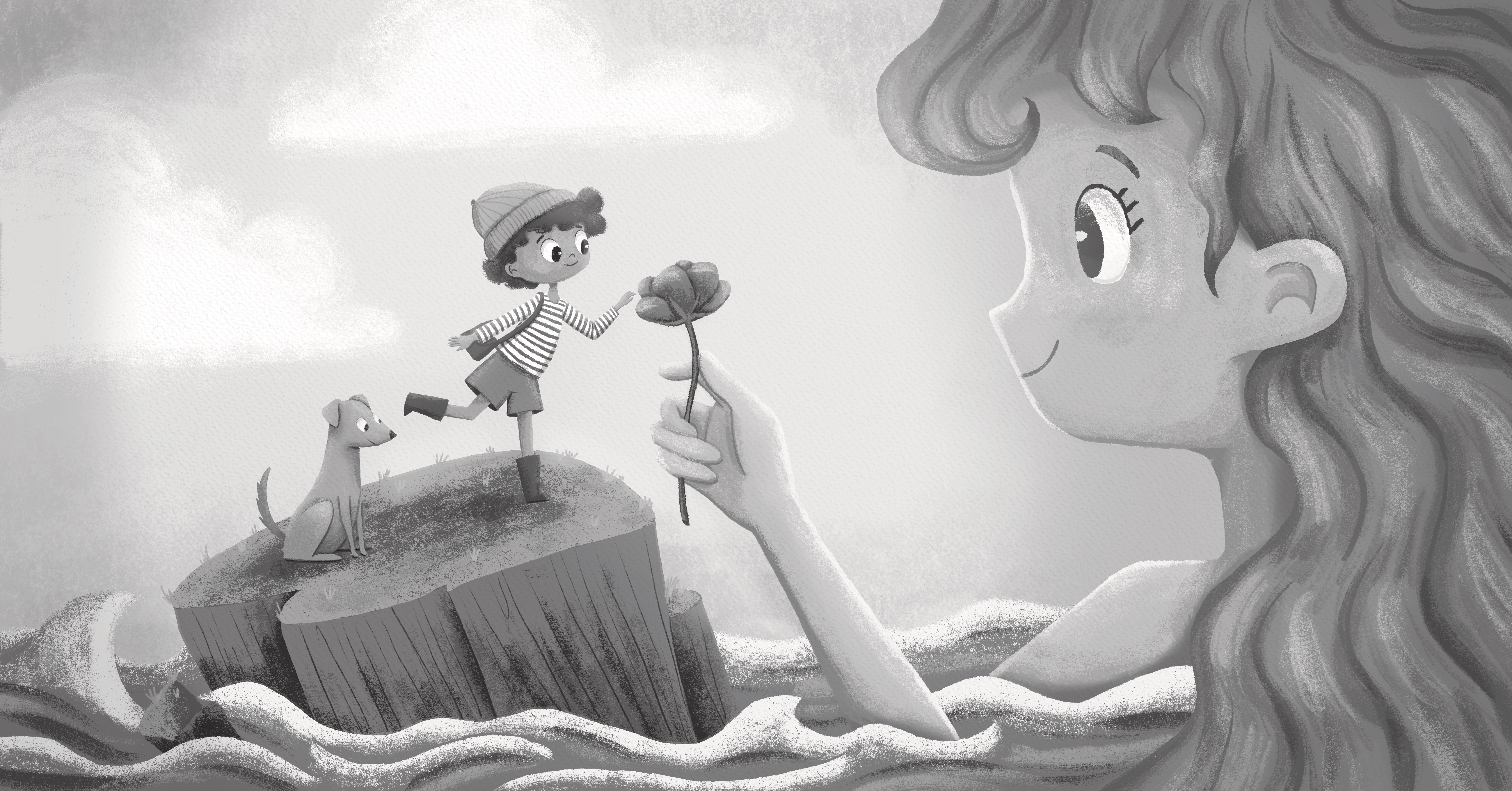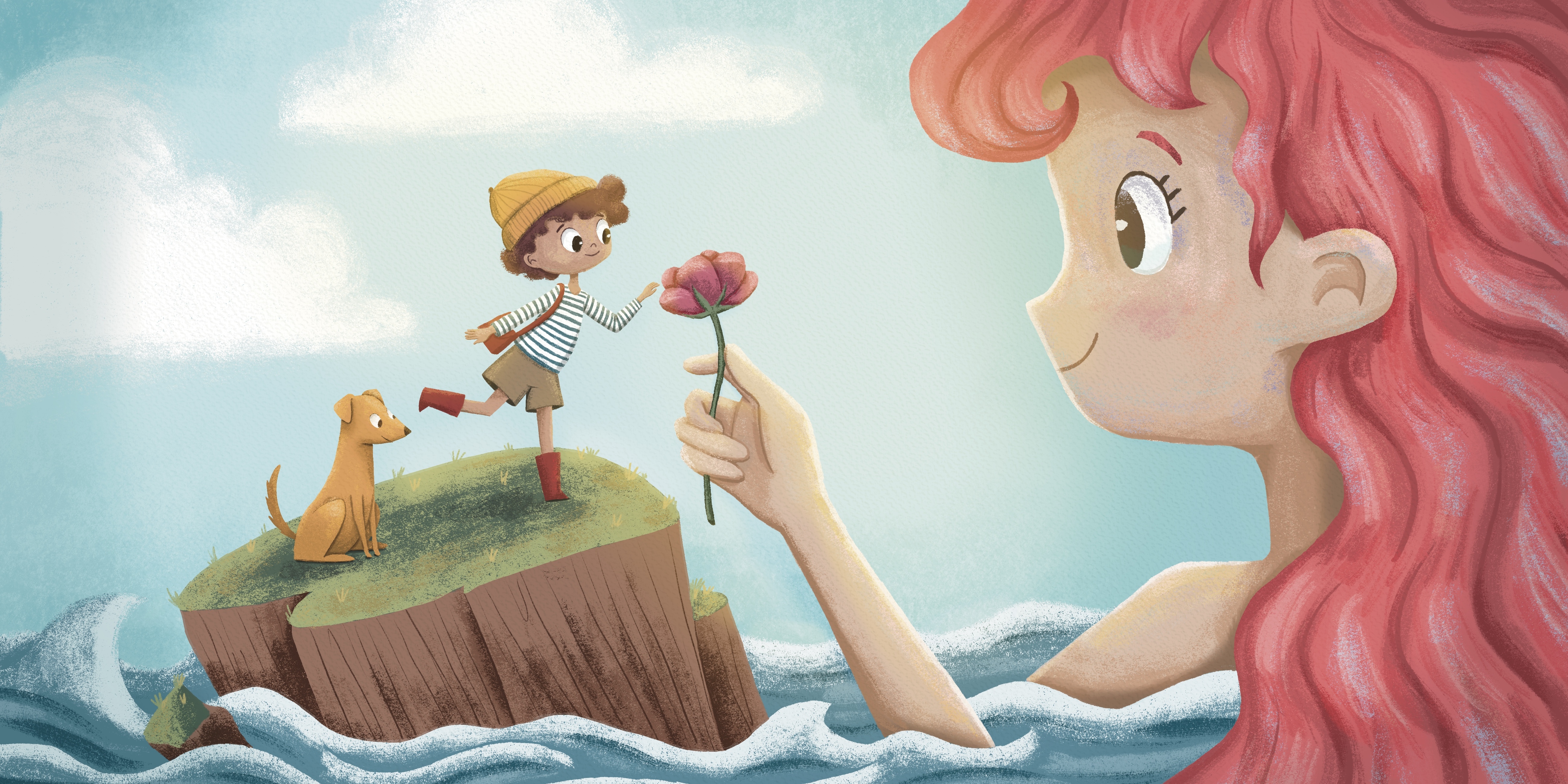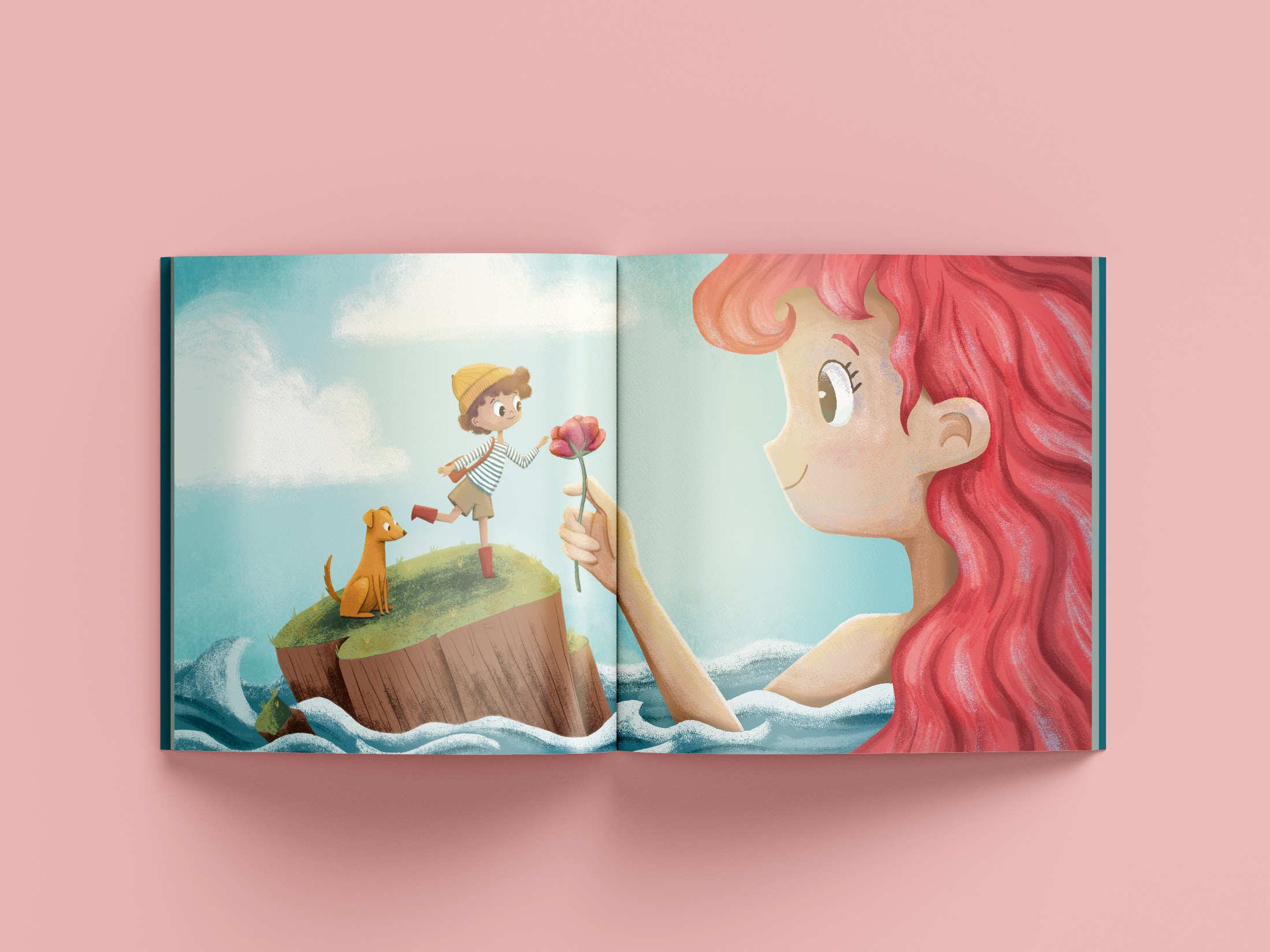 This illustration is a personal project about a sailor boy that travels with his best friend stray dog and found a mysterious sea creature who gives him a gift.