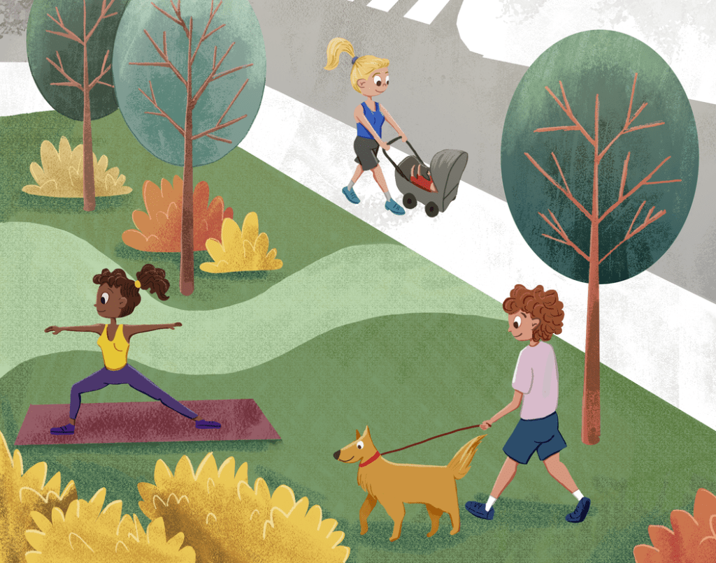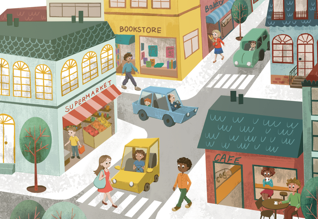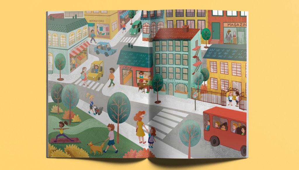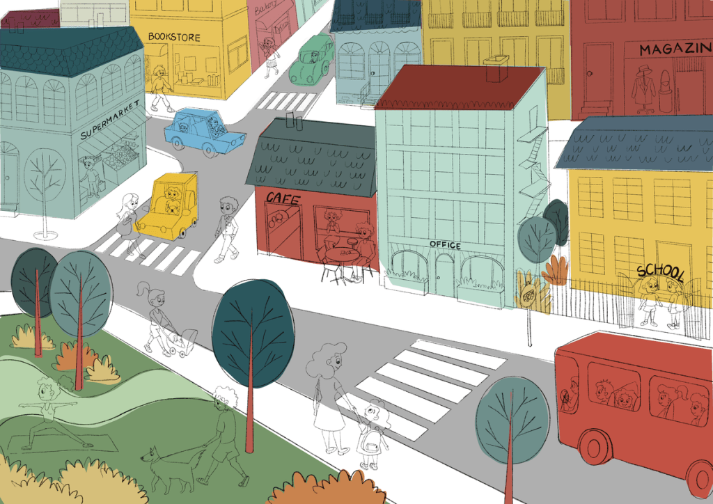 This illustration is a personal project that aims to portray a city in the morning with all the different activities that its inhabitants can experience.